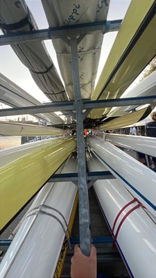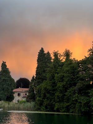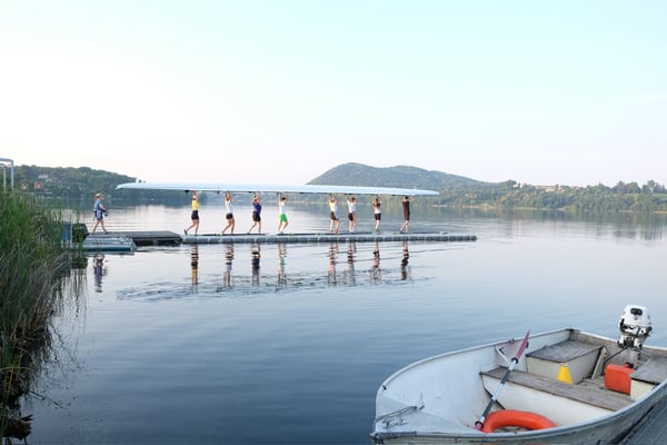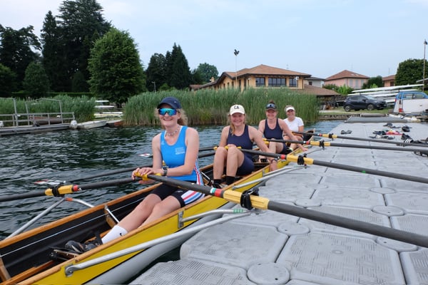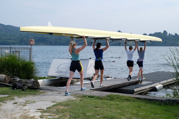 Fündig wurden wir in Italien am Lago di Monate. Im Schlepptau hatten wir einen großen Anhänger mit 17 Ruderbooten für insgesamt 30 RuderInnen.