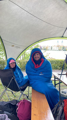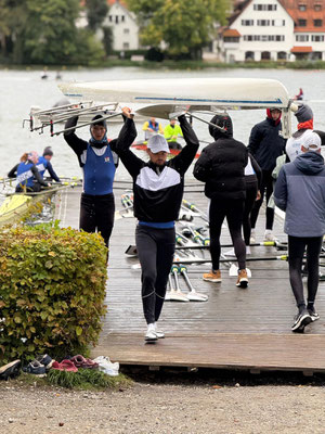Die letzten beiden Siege des ersten Regattatages wurden in Mixed-Doppelzweiern errungen: Selma Ruh und Gregor Bühler fuhren als Rennboot-Neulinge in einem Sonderrennen auf Platz 1, und verteidigten diesen am Folgetag. Lukas Schulth und Anna Baur gewannen ein knappes Rennen in der Master-Kategorie. Im Laufe des Tages hatten Wolken und Regen die wärmende Sonne immer weiter verdrängt, sodass nach am Samstag Abend alle Rennfahrer*innen nass und durchgefroren waren. Nach einem kurzem Riggern und Befestigen der Boote fuhren die Junior*innen im Mietbus zurück ins eigene, warme Bett, während sich die Studenten auf den Weg in eine vom RV Waldsee bereitgestellte Turnhalle machten. Nach einer guten Stunde in der Kälte wurde die Halle auch aufgeschlossen und der Abend wurde mit einer heißen Dusche und einem warmen Essen im Restaurant beendet.
