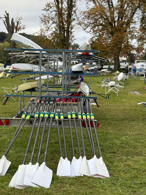 Ebenso erfolgreich war der Zusammenschluss aus Anton Gnann (Neptun Konstanz) und Loris Waidelich (Stuttgarter RG), die im Leichtgewicht-Männer-Doppelzweier gewannen. Mit dem Preis des Vorstands des Ruderverein Waldsee schon in der Tasche und einer Besatzungsänderung haben Salome Horrer, Johanna Györffy, Zoe Würfel und Maximiliane Blaser auch am Sonntag den Frauen-Doppelvierer gewonnen. Die letzte Medaille des Tages und der Regatta erkämpften sich Gregor Bühler und Selma Ruh, die im Sonderrennen den Vortagessieg im Mixed-Doppelzweier verteidigten. Zum Abschluss der Regatta machte uns das Wetter noch ein kleines Geschenk, denn beim Riggern und laden der Hänger blieb es vorübergehend trocken. Kaum waren die Boote befestigt und die Skulls verstaut brach der Himmel auf und es Regnete in Strömen. Mit 21 Siegen, die durch die noch nicht gelieferten Medaillen vorübergehend mit Schokolade geehrt wurden, in der Tasche flüchteten wir vor dem Regen zurück nach Konstanz, wo die Sonne gerade wieder aus den Wolken schaute und uns im trockenen die Hänger abladen ließ.